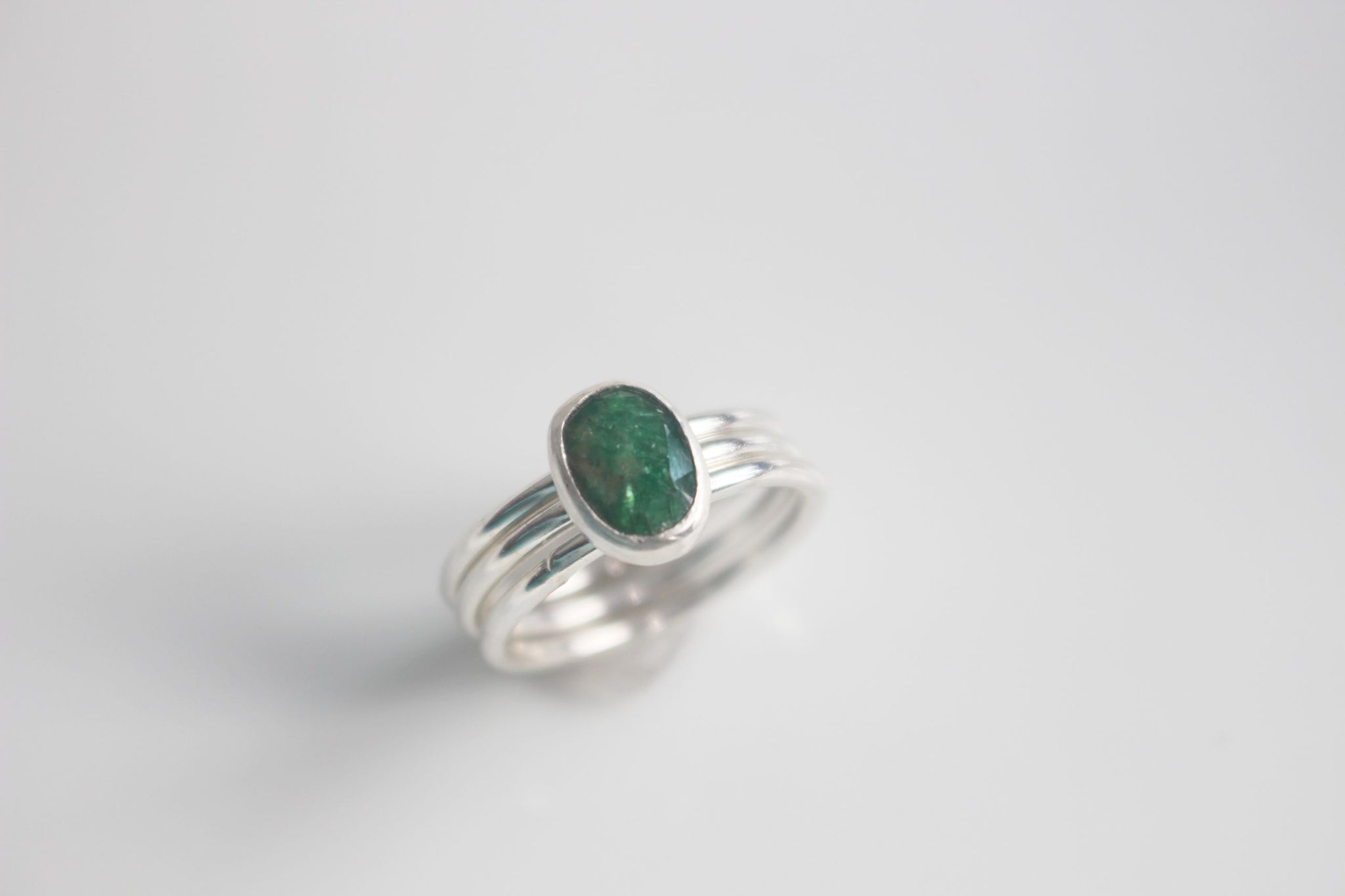 This elegant trio stacking ring set features two smooth sterling silver bands complemented by a third band showcasing a green tsavorite stone. Crafted from solid sterling silver, the set offers both durability and a timeless aesthetic. Designed for size 6.5, these rings stack effortlessly to add a refined touch of color and sophistication to any ensemble. Ideal for those seeking understated luxury with a distinctive gemstone accent.