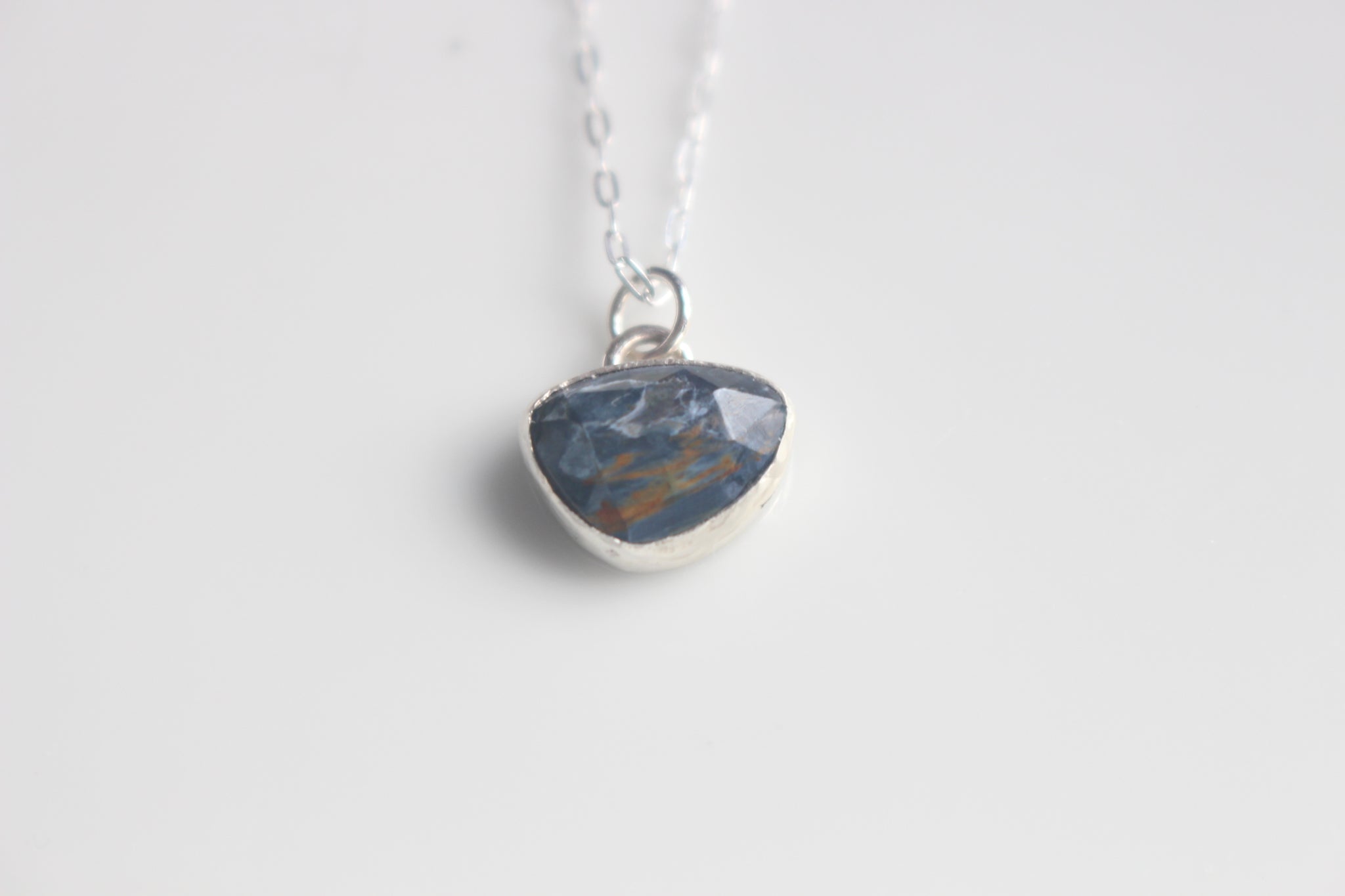This Pietersite Necklace features a delicate small pietersite stone showcasing captivating blue and brown hues, set in sterling silver. Suspended from an 18-inch sterling silver chain, it offers a refined, versatile accessory that complements both casual and formal styles with understated elegance.
