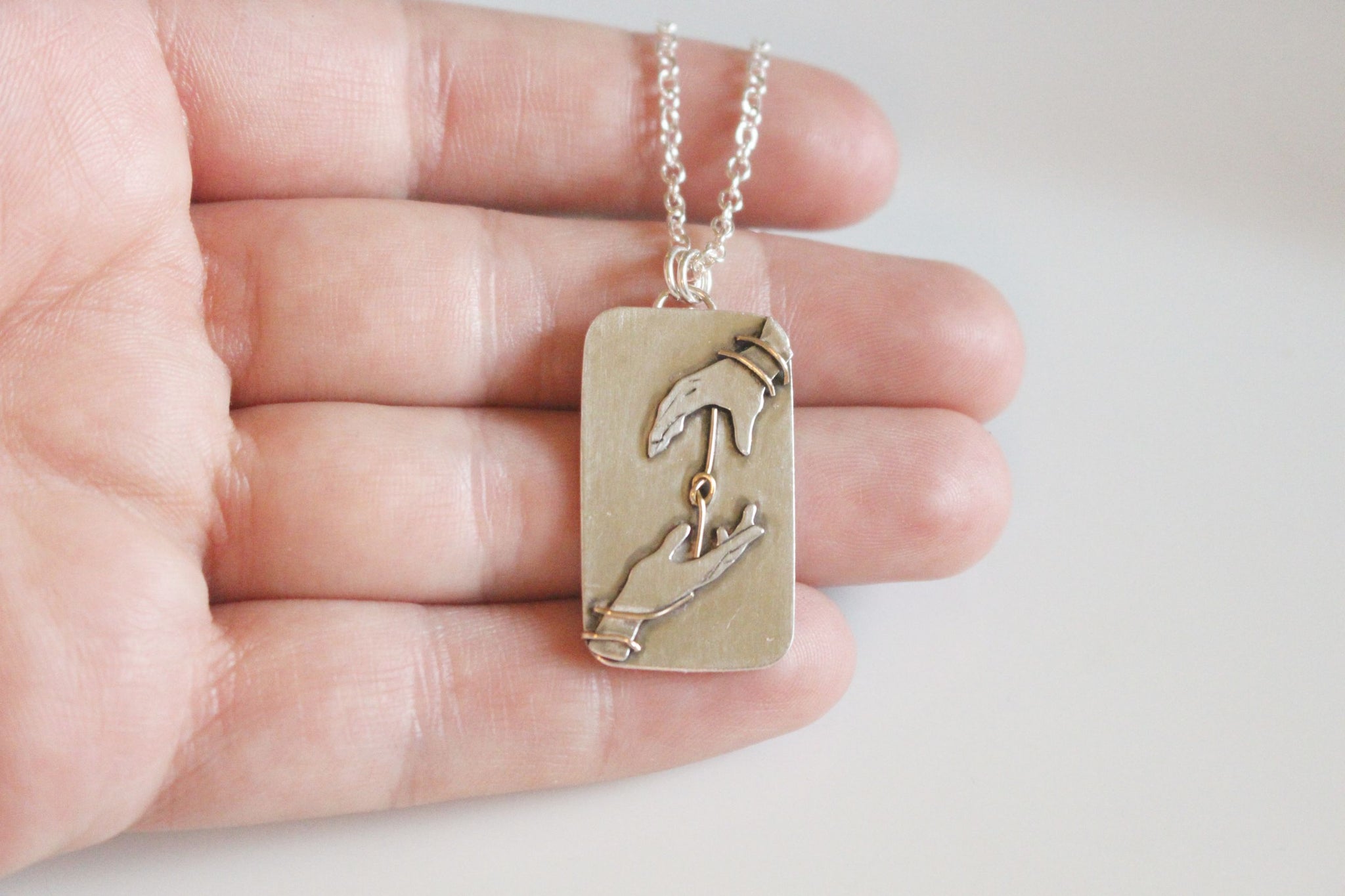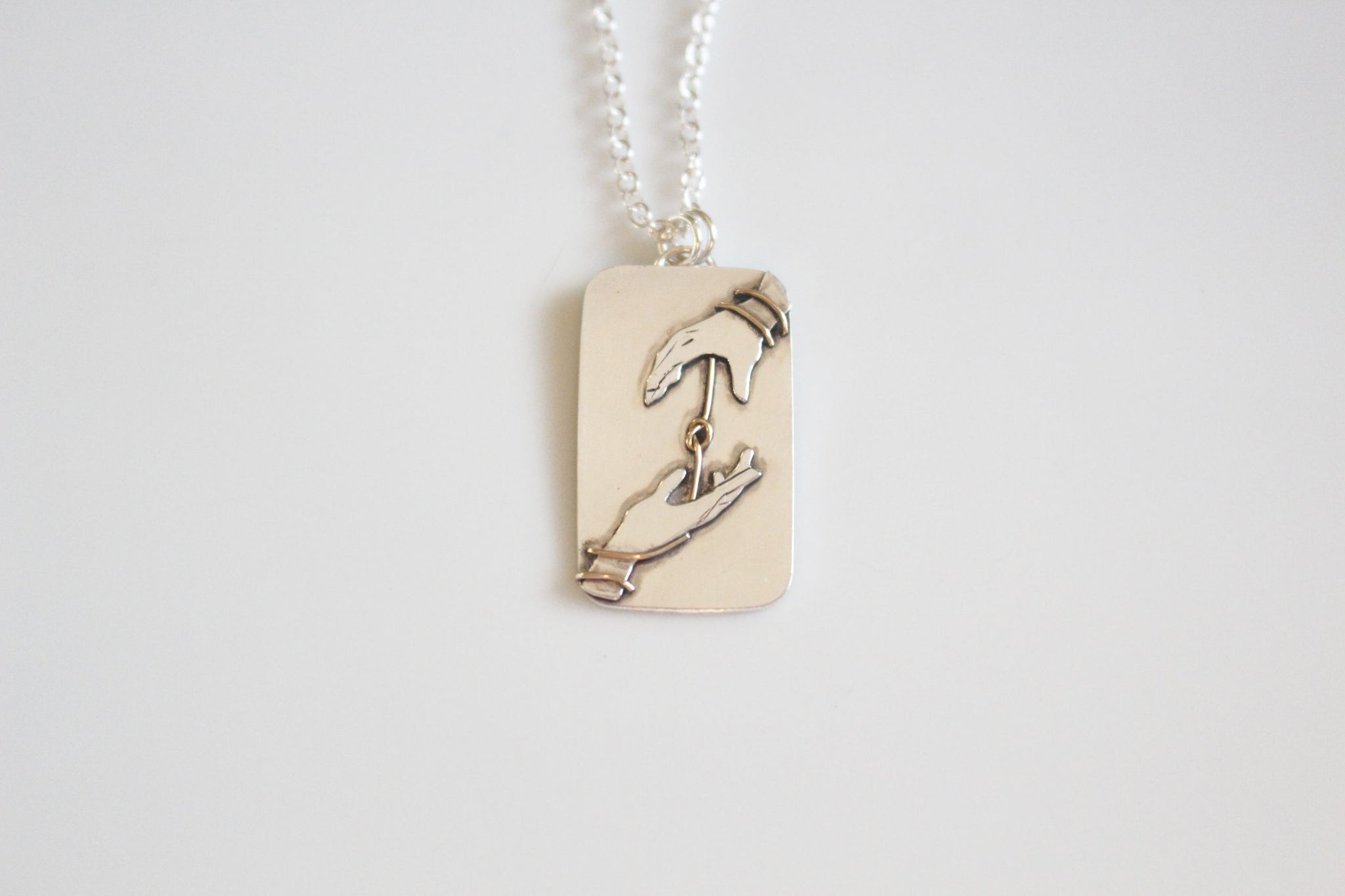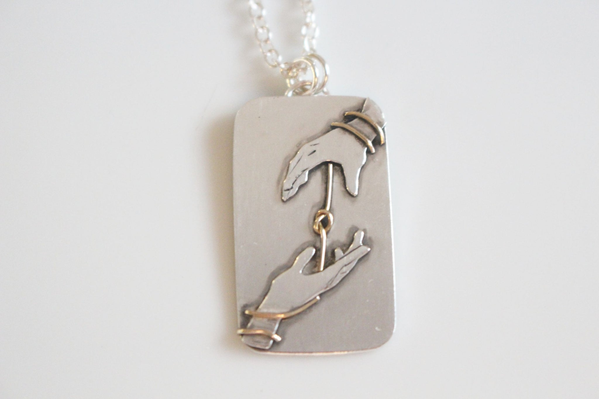 Two shadow box style hands pop from the background and are wrapped by a 14K gold thread that ties them together.